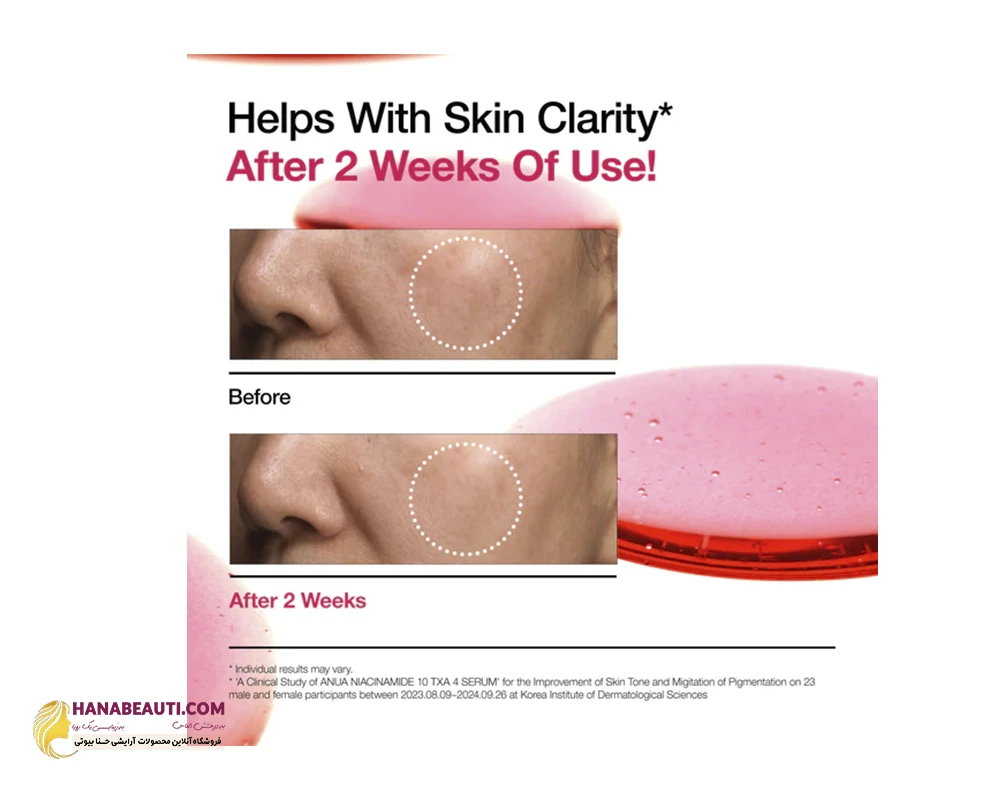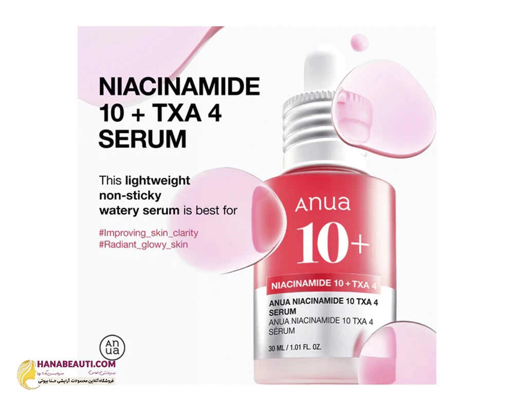 محصولاتی مانند Anua Niacinamide 10% + TXA 4% ادعا دارند که با این نسبت (10٪ نیاسینامید و 4٪ TXA) تأثیر در روشن شدن پوست، کاهش لک و بهبود ساختار پوست ارائه میدهند.