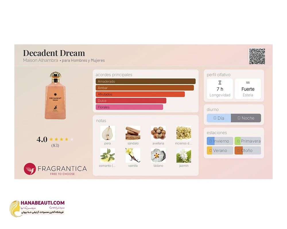 اگر به دنبال عطری هستید که شیرینی دلنشین، ماندگاری بالا و رایحه‌ای جذاب داشته باشد، ادوپرفیوم زنانه الحمبرا دکادنت دریم ۱۰۰ میل بهترین انتخاب شما خواهد بود. با خرید از حناگالری، تجربه‌ای لوکس و مطمئن از رایحه‌های زنانه خواهید داشت.