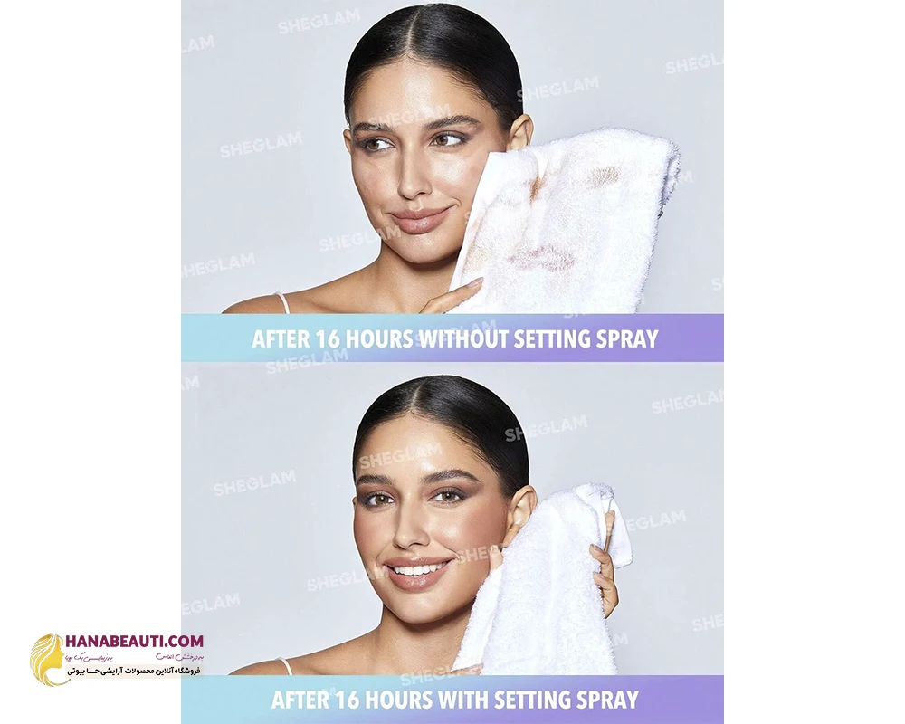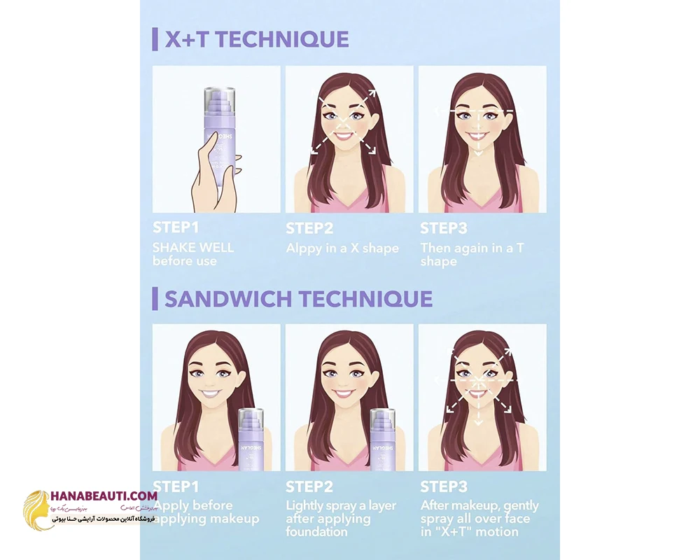 بعد از اتمام آرایش، اسپری را به خوبی تکان داده و در فاصله 20 الی 30 سانتی متری صورت قرار دهید و بعد از بستن چشمان خود، اسپری کنید. چند ثانیه تا خشک شدن اسپری روی صورت صبر کنید.