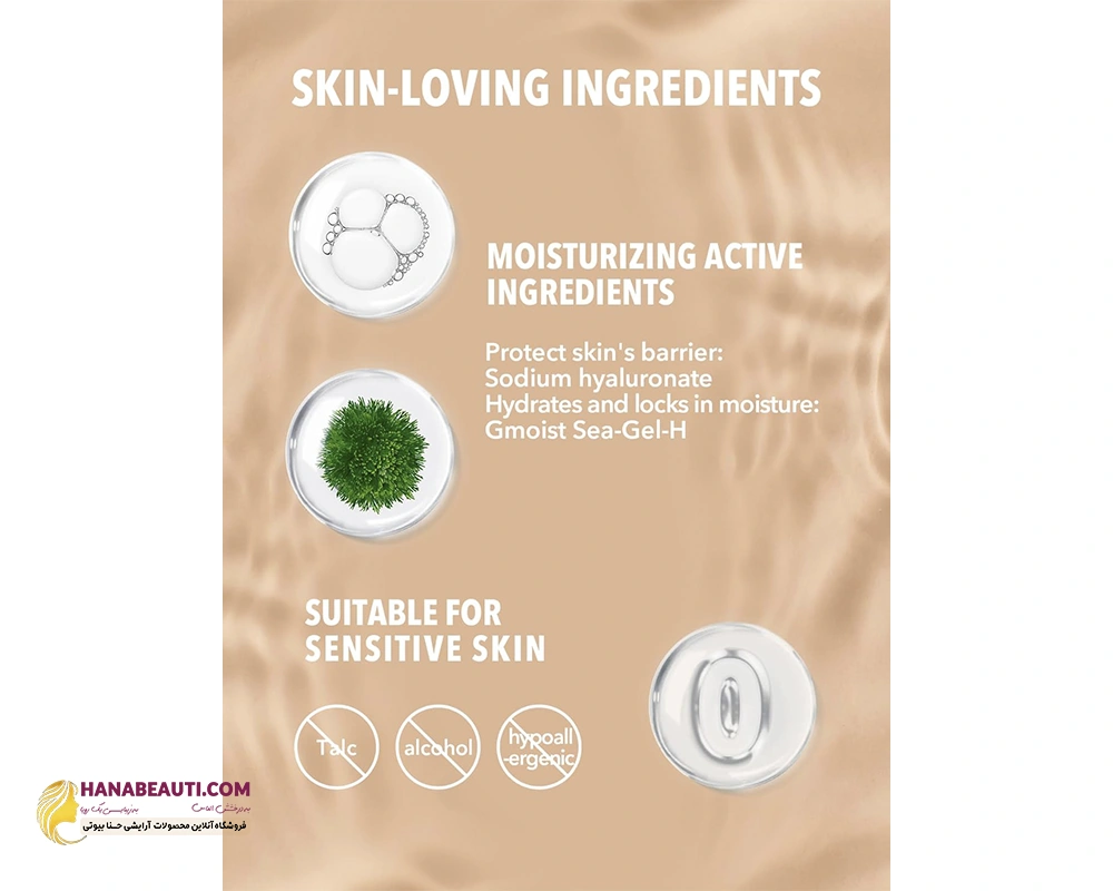 مرطوب کننده و دوستدار پوست: ساخت با هیالورونات سدیم و Gmoist Sea-Gel-H، کرم پودر ما آبرسانی عمیقی به پوست شما می دهد و حتی در هنگام آرایش، پوست شما را مرطوب و تغذیه می کند. همچنین برای پوست های حساس مناسب است، زیرا فاقد تالک، الکل است و با مواد غیر حساسیت زا ساخته شده است.